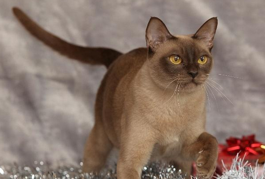 缅甸猫的外形优雅而迷人,具有独特的肌肉感和紧凑的身材。它们的体型属于中等大小,骨架结实,肌肉发达。整体给人的感觉是既精致又强健。缅甸猫的毛发短而密,摸上去手感如丝般顺滑,非常光滑且有光泽。它们的毛色通常为深色,带有温暖的金色或深褐色,眼睛则呈现出明亮的黄色或绿色,与其浓密的毛发形成鲜明的对比。