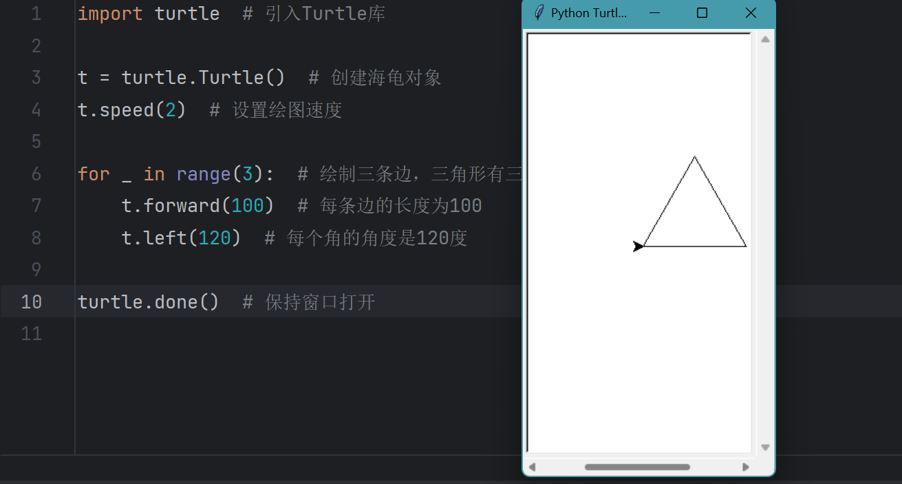 import turtle # 引入Turtle库 t = turtle.Turtle() # 创建海龟对象 t.speed(2) # 设置绘图速度 for _ in range(3): # 绘制三条边,三角形有三个角 t.forward(100) # 每条边的长度为100 t.left(120) # 每个角的角度是120度 turtle.done() # 保持窗口打开