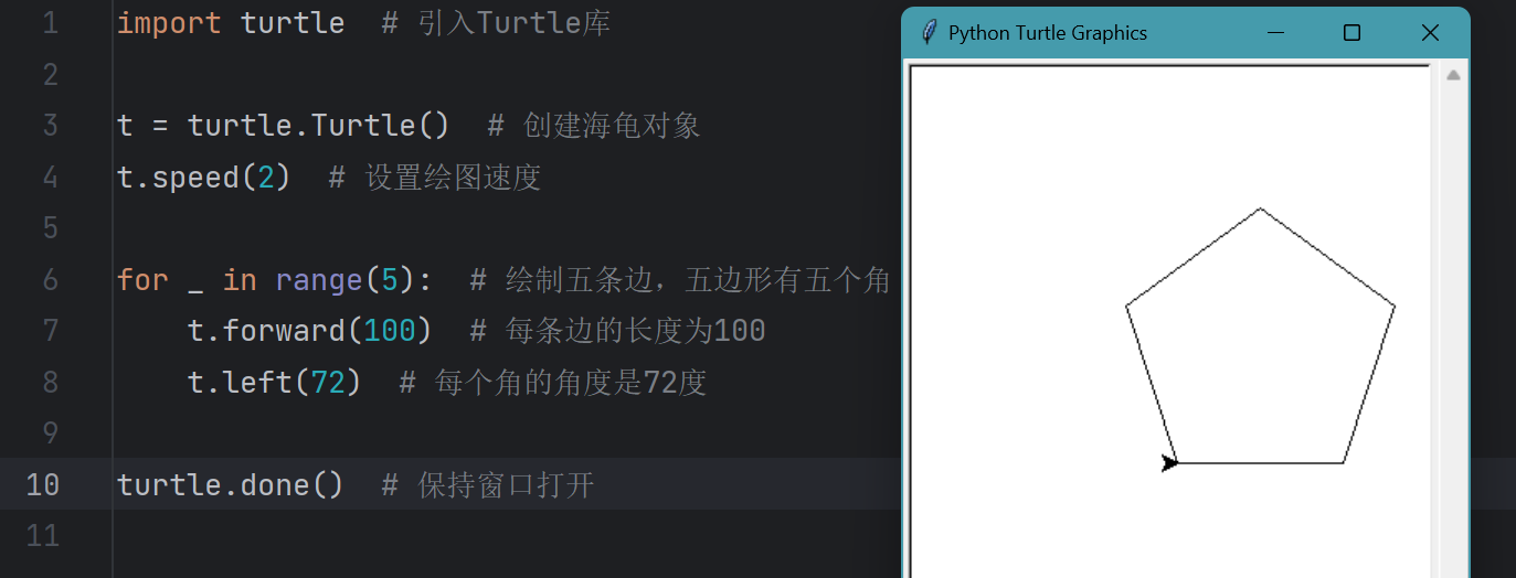 在今天的代码中,我们依然使用了for循环。for _ in range(5)表示我们要绘制五条边,每一次循环都会执行一次forward(100)和left(72)。range(5)表示循环5次,_是一个常见的占位符,表示循环过程中不需要用到该值。