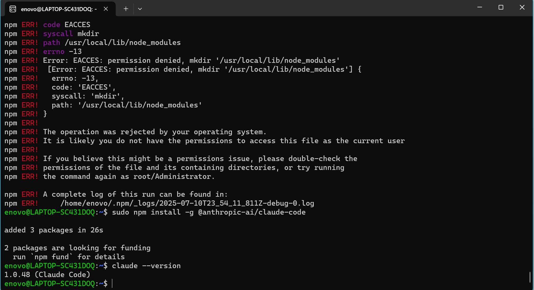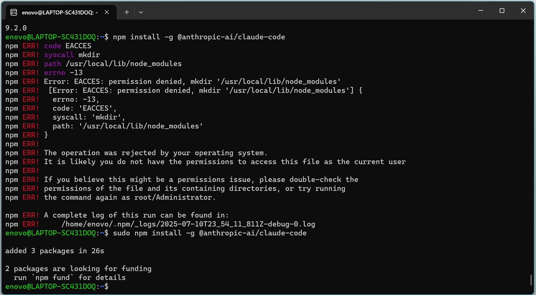 这是 npm 全局安装权限问题,在 WSL 或 Linux 系统中非常常见。